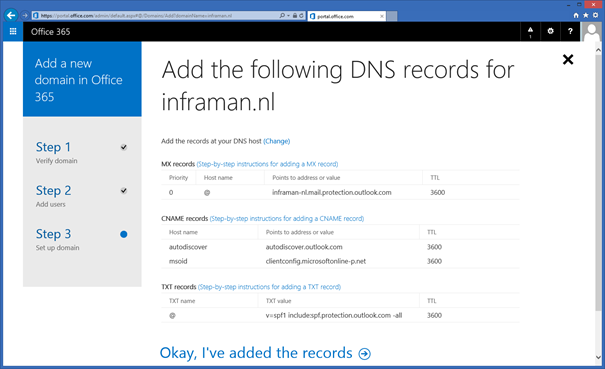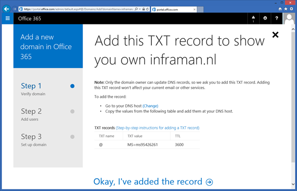 If so, go back to the Microsoft Online Portal and click Okay, I’ve added the record. Please note that it can take some time before the DNS records are replicated. I typically set my DNS TTL to only 10 minutes, but if your TTL is 24 hours it can take some time… When the test succeeds your new domain is verified: