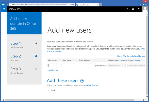 The first step you want to do is add an additional SMTP domain, in this blog post this will be the domain inframan.nl. Navigate back to the Microsoft Online Portal, select Domains and click on +Add domain. The add domain wizard will show up which consists of three steps: