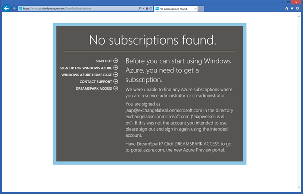 The portal for Windows Azure can be found on http://manage.windowsazure.com, but when you try to logon using your tenant admin account (the one you’re using for Office 365 as well) you’ll get a warning that no subscriptions are found. This makes sense because there’s only an Office 365 subscription to this account.