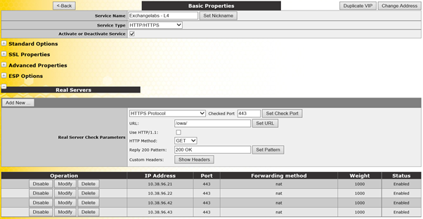 Figure 4. Two Exchange 2013 servers (.21 and .22) and Two Exchange 2016 servers (.42 and .43) in the same VIP on the Load Balancer.
