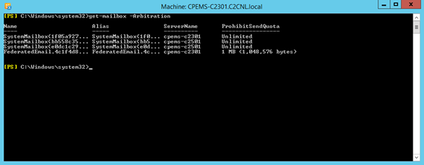 Get-Mailbox –Arbitration –Identity "FederatedEmail*"} | Set-Mailbox –Arbitration –ProhibitSendQuota 1MB