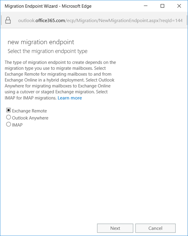 To create a new endpoint, click on the more option (the three dots, next to the refresh button) and select migration endpoints. Click the + icon to start the new migration endpoint wizard. For the migration endpoint type, select Exchange Remote and click Next.