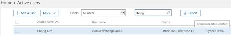 Suppose we have a cloud identity in Office 365 for a user named Chong Kim, he has an E3 license, a username ckim@exchangelabs.nl and this is also his primary SMTP address.