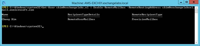 Get-User ckim@exchangelabs.nl | Enable-RemoteMailbox -RemoteRoutingAddress ckim@exchangelabsnl.mail.onmicrosoft.com