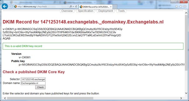 Onced added to DNS you can use the http://dkimcore.org/tools site to test the public DKIM Core key. You can enter the selector and domain name, or you can enter the record that was found in the previous step. Entering the selector and domain name makes the most sense I guess: