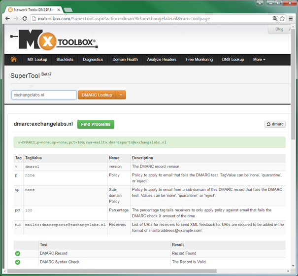 So, for my exchangelabs.nl domain the following DNS TXT record _dmarc.exchangelabs.nl will be created: