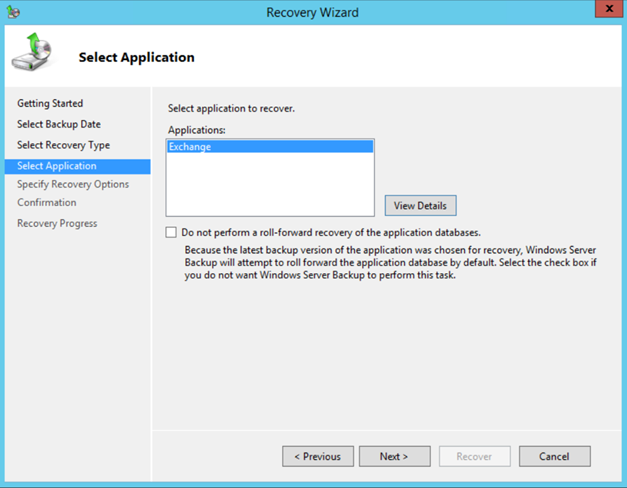 There’s only one application available on this Exchange server (but this can be different in your environment of course) so in the Select Application window you should see Exchange as shown in the following screenshot:
