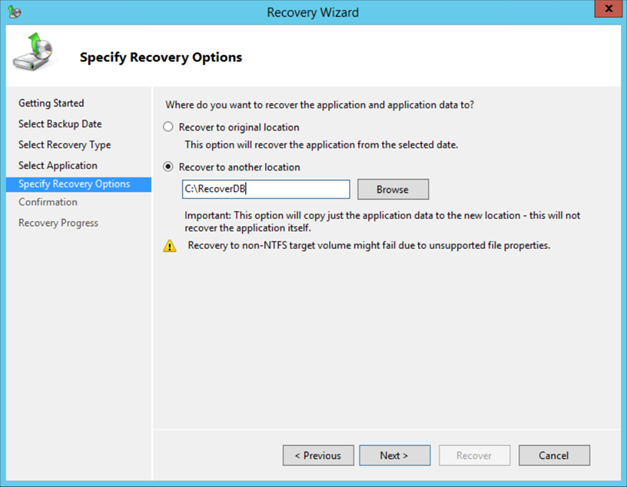 The next step is to determine where to restore the mailbox database. You can select the Recover to original location option but this will overwrite the existing mailbox database and that’s not we want to achieve here. The second option is Recover to another location, select this option and enter a directory where to restore, like C:\RecoverDB as shown in the following screenshot: