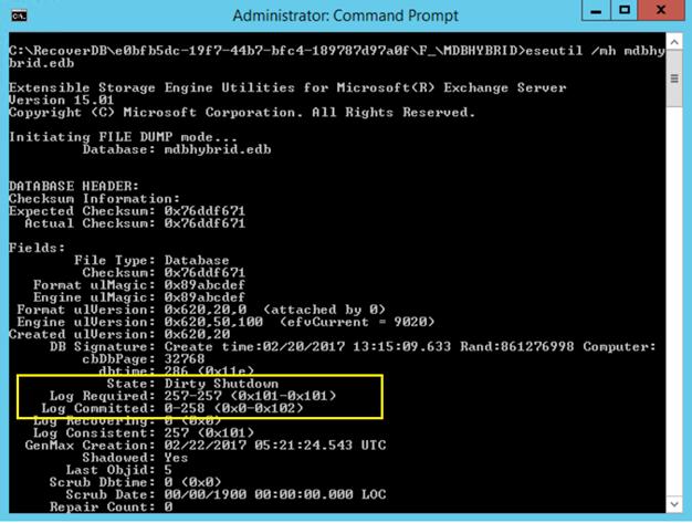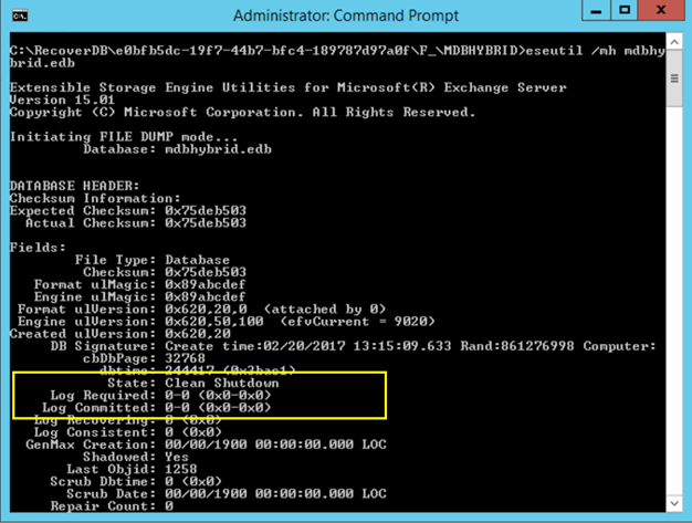 When you open a command prompt, navigate to this directory and execute the ESEUTIL /MH <database filename> command the mailbox database should be in a dirty shutdown state: