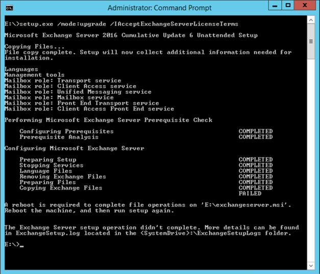 “A reboot is required to complete file operations on ‘E:\exchangeserver.msi’. Reboot the machine, and then run setup again”