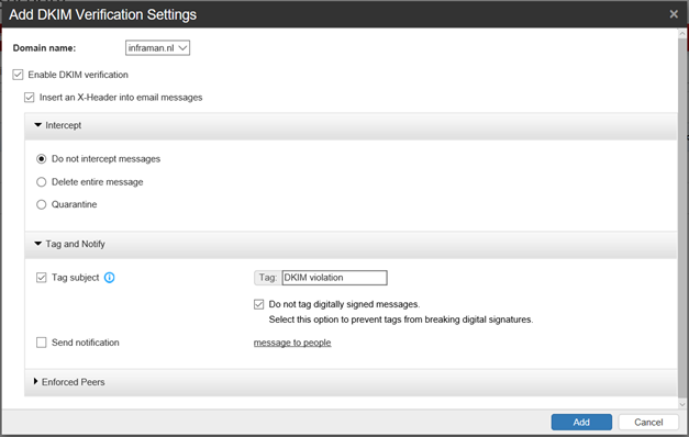 You can configure this for all domains or just for one domain (i.e. the inframan.nl domain in my environment) using a drop down box. Check the Enable DKIM verification checkbox and when needed check the insert an X-header into email messages checkbox. You can also add a tag to the subject line in case of DKIM verification fails by checking the Tag subject checkbox. Be careful, when doing this with digitally signed messages you will destroy the digital signature (the size of the message will change and therefore the hash of the message), so the recipient will see an error message regarding a malformed signature. To prevent this check the Do not tag digitally signed messages checkbox: