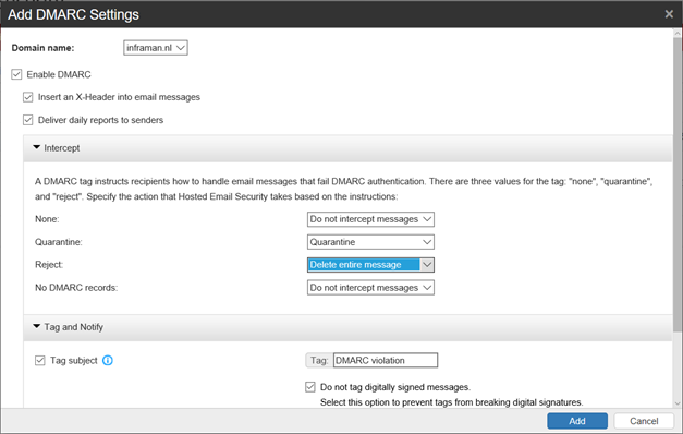 In Reject option, you can select Delete entire message (default), but also select Do Not Intercept or Quarantine, in case you don’t feel comfortable deleting inbound messages. Click Add to store the DMARC verification to the HES configuration.