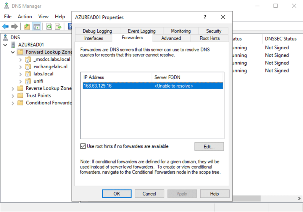 For external recurring DNS queries, and the Azure forwarder with IP address 168.63.129.16 on the forwarders tab of the DNS server as shown in the following screenshot: