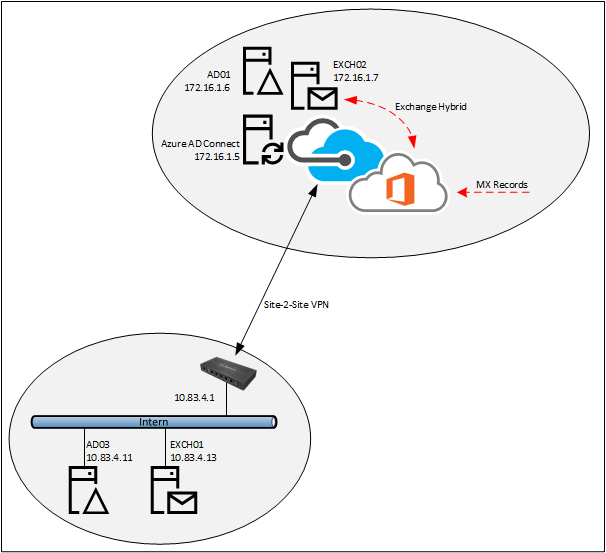 Currently Exchange server are located on-premises in a hybrid scenario. There’s already a Domain Controller in Azure, and the Azure AD Connect is running in Azure too. Now I want to install an Exchange 2019 server in Azure and run the Hybrid Configuration Wizard to create a hybrid configuration with the Exchange 2019 server in Azure. Webmail and Autodiscover will point to the Exchange server in Azure as well. In short, the configuration will look something like this: