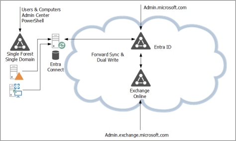 In the current situation the SOA is on-premises. A user object or mailbox is edited on-premises, and the complete object is synchronized with EntraID. From there, a forward sync mechanism sends the Exchange specific attributes to Exchange Online. Be aware that the forward sync normally takes only a few seconds, but occasionally it can take hours. This is shown in the following figure: