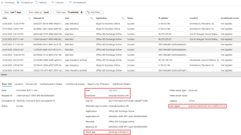 Now an overview will be shown of all basic authentication attempts in your environment. When you select one entry it will show additional details, including the client application, the username and the the user agent (which identifies the client app) as shown in the following screenshot (click to enlarge):