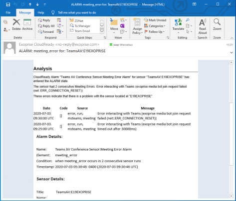 When the sensor is triggered because of a transaction, an alarm is sent to the email address that is configured and this gives you an immediate overview that something is wrong with the service. And to be honest, I was a bit surprised how often alarms are generated and thus how often you will receive an email. The email will show which sensor is generating the alarm, some analysis information and alarm details as shown in the following screenshot.