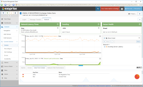 When configured, a sensor performs synthetic transactions against the cloud service. For example, the Exchange Online sensor looks at the average logon time, message transfer speed and network latency. The results are shown graphically for your own sensor, but because it is a SaaS solution Exoprise can compare your results against the results of the rest of the world which they call ‘crowd’. This is shown in the following screenshot, the lower line is my own sensor, the upper (thinner) line is the crowd average.