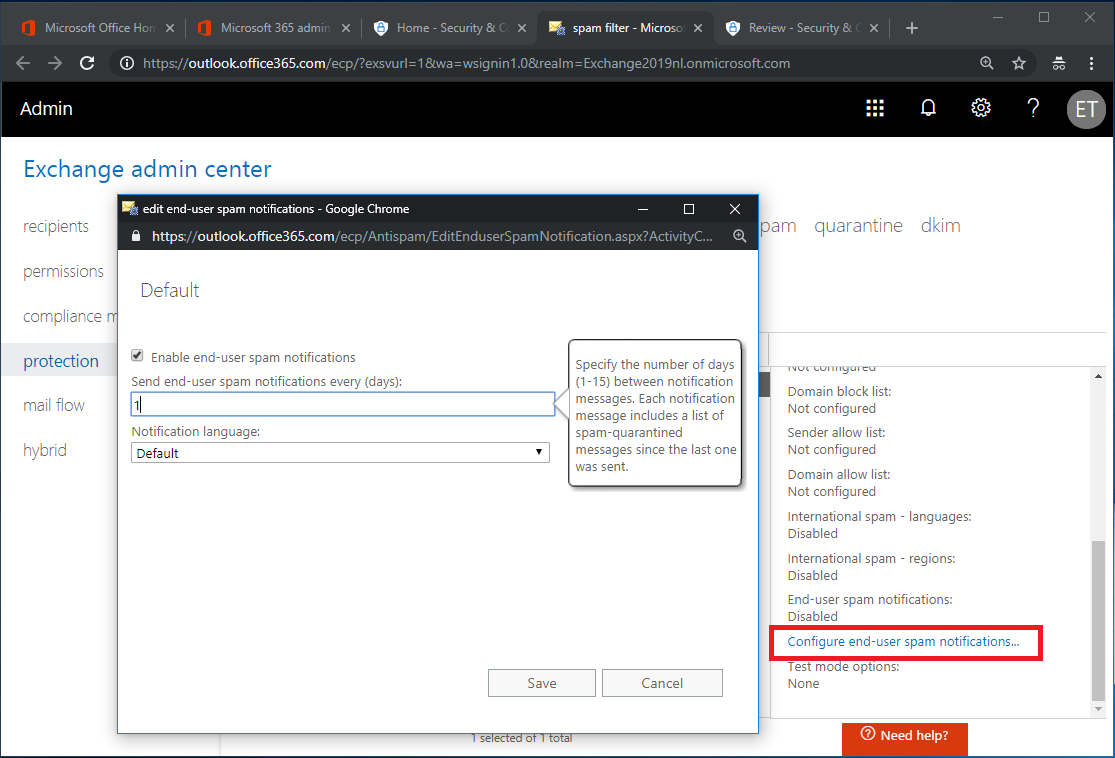 It is also possible to create a mailbox-based quarantine. Select the protection navigation option and click the spam filter tab. In the action pane on the right, scroll down and click the Configure end-user spam notifications option. In the pop-up box, check the enable end-user spam notifications checkbox, change the number of days (default is 3) a notification should be sent and the (default) language as shown in the following screenshot (click to enlarge):