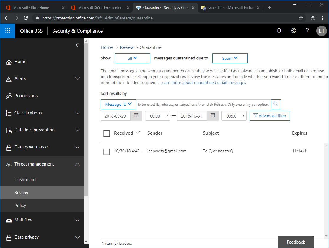 This is an organization wide quarantine environment that’s available only to the tenant administrator. Logon to the Office 365 portal and select Security and Compliance under Admin centers. It is also possible to navigate directly to the Security and Compliance admin center via https://protection.microsoft.com. You’ll find the Quarantine under Threat Management and Review. By default, quarantined message will be kept for 15 days before they are deleted. This can be extended under the spam and bulk actions of the spam filter policy.