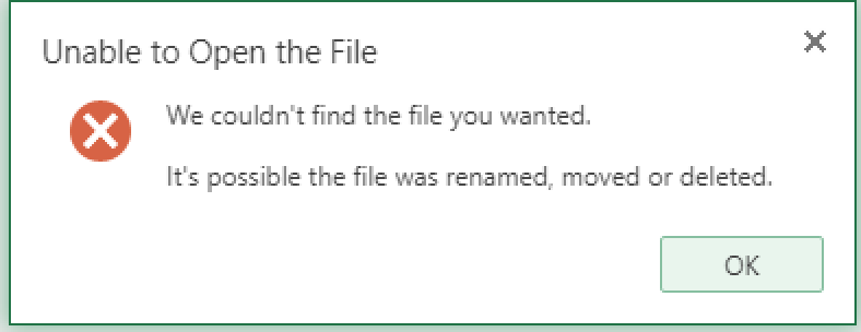 “Unable to open the file. We couldn’t find the file you wanted. It’s possible the file was renamed, moved or deleted.”