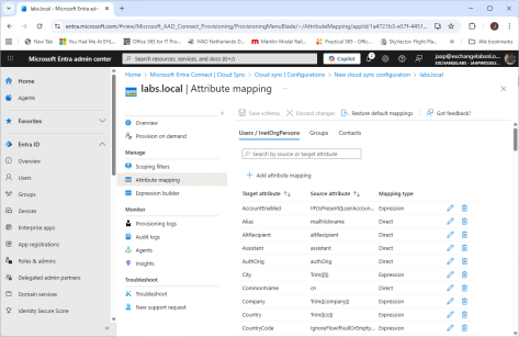 - The attribute mapping is optional, this is where the attributes in Active Directory are mapped to attributes in Entra ID. In a typical environment there’s no need to change this, but your environment can be different of course. Change this when needed.