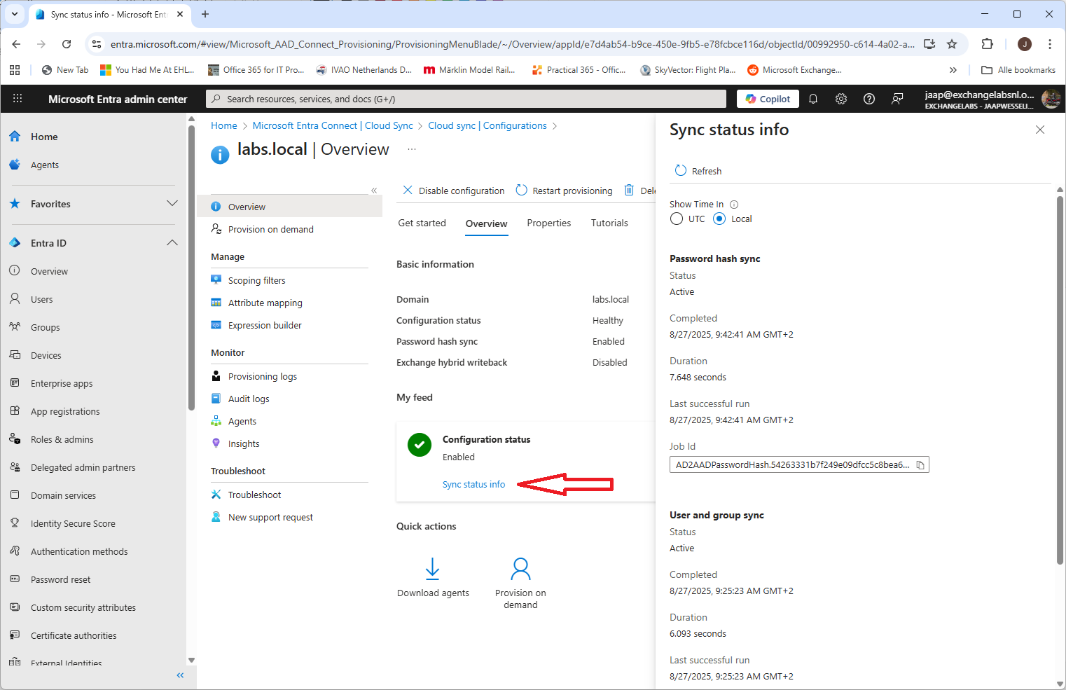 Entra Cloud Sync can be managed using the Entra Portal (https://entra.microsoft.com). Login with your administrator account and navigate to Entra Connect –> Cloud Sync. Here, you can view the cloud configuration (created in the previous step) and check provisioning logs and audit logs.