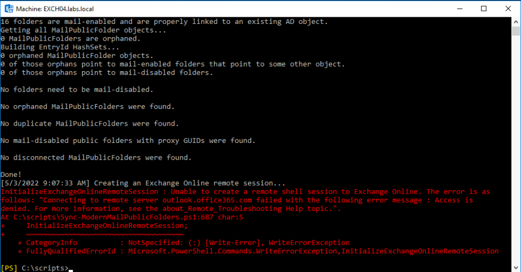 Now when running the Sync-ModernMailPublicFolders.ps1 again it succeeds and finishes successfully.