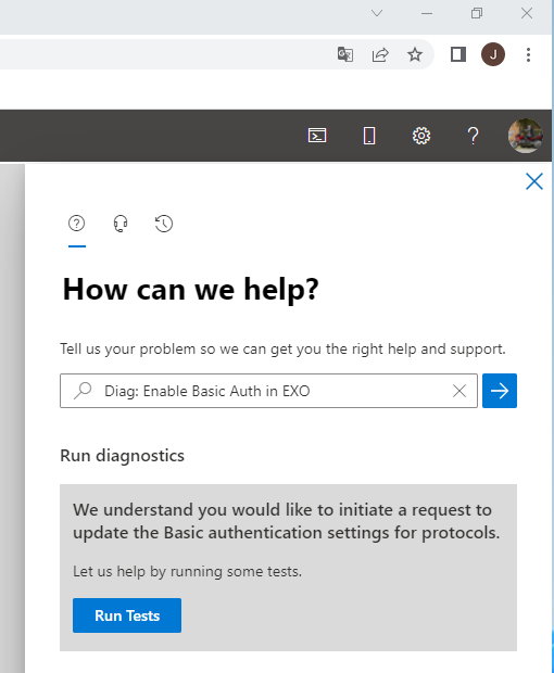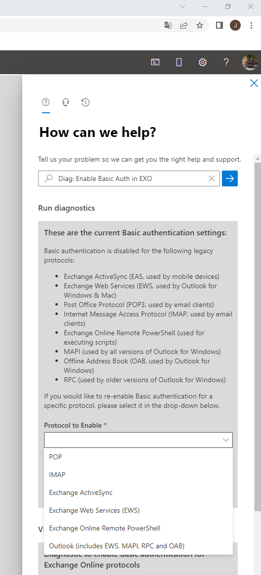 A workaround is to enable basic authentication only for PowerShell. To do this, click ‘Help & Support’ in lower right corner and in the ‘how can we help’ enter the following text “Diag: Enable Basic Auth in EXO” as shown in the following screenshot:
