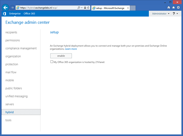 In the Exchange Admin Center in the navigation pane select hybrid. In the hybrid setup window click the enable button to initially enable the hybrid mode in your organization. The option My Office 365 organzation is hosted by 21Vianet should be left unchecked. Office 365 in China is hosted by 21Vianet so this option does not apply to us (unless you are in China and your organization is hosted by 21Vianet of course).