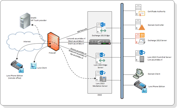 Not all SIP trunk providers are supported to work with Lync Server 2013 (or 2010). For an overview you can check the Infrastructure qualified for Microsoft Lync pages (check the services tab) on the Microsoft website. In my lab environment I will use a SIP trunk from OneXS, based out of Amsterdam, The Netherlands. I have one Lync 2013 Standard Edition Front-End server, one Lync 2013 Edge server and a dedicated Lync 2013 Mediation server as shown in the following figure: