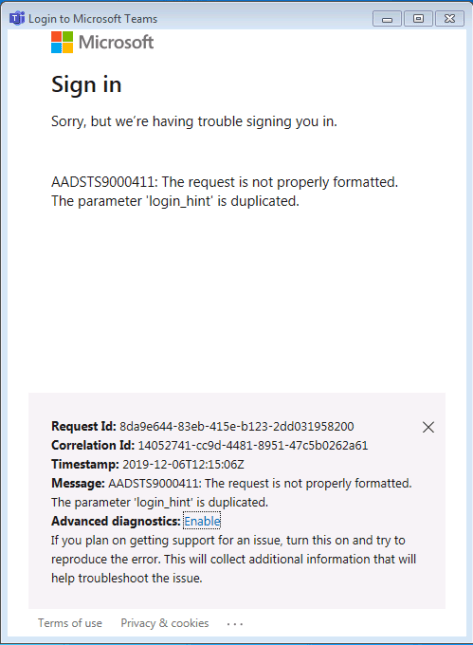Every now and then we get a call from end users that they cannot login at Microsoft Teams and they get an error message “The request is not properly formatted” and “The parameter ‘login_hint’ is duplicated.“, especially after changing the user password. The error message is shown in the following screenshot: