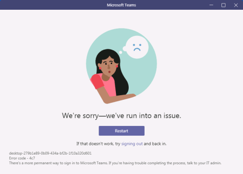 When the error occurs, close the Windows and the following We’re sorry – we’ve run into an issue window will appear:
